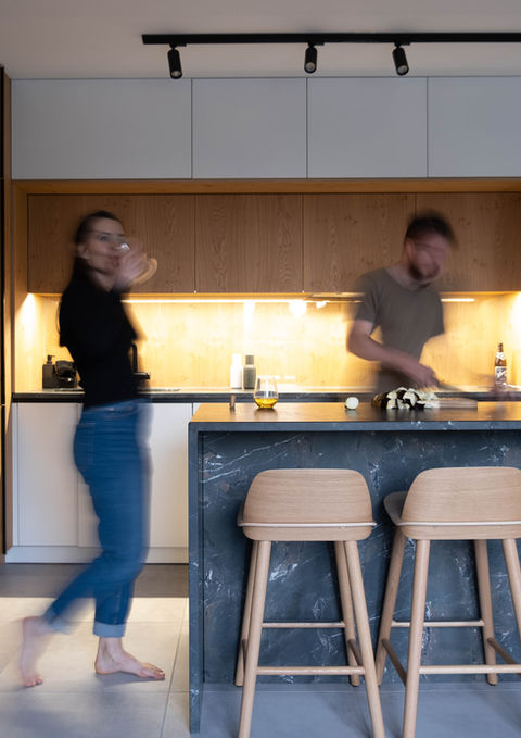 Die Küche zeichnet sich durch Naturstein und Eichenfurnier aus, ergänzt durch den Barhocker Muuto Nerd.